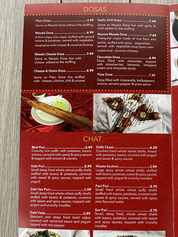 I can't tell if these are authentic Gujarati dishes but seems maybe only half of them are. I know anything with Pav rolls are Mumbai-origin and Dosas are South Indian food.